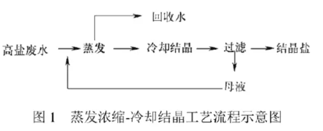 該工藝技術適用于高鹽廢水中COD相對較低、所含鹽類的溶解度相對溫度變化敏感的高鹽廢水,通過控制結晶溫度,可能得到比較純凈的結晶鹽。缺點是黨廢水中鹽類相對的溫度變化不敏感時,效率較低,且在工藝中,會有大量冷卻的母液需要返回到前段工藝再次加熱蒸發、濃縮處理,導致工藝流程長、能耗高,處理效率較低。