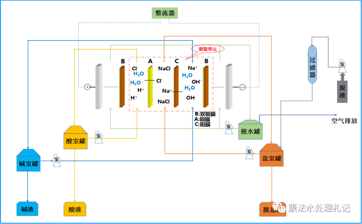 雙極膜電滲析的(de)系(xi)(xi)統(tong)(tong)相對簡單(dan),系(xi)(xi)統(tong)(tong)能(neng)耗主要由整流器、動設備組成。以下是(shi)常規雙極膜系(xi)(xi)統(tong)(tong)簡易流程(cheng)圖。