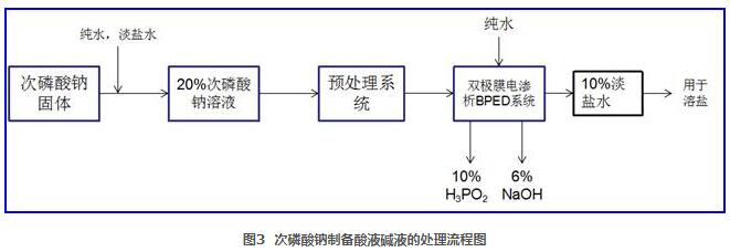 次磷酸鈉固體經過溶解配成20%左右的溶液,后經預處理除重金屬及COD等成分以滿足進水條件,進入雙極膜電滲析裝置制酸堿,產生質量分數約10%的次磷酸溶液、質量分數約6%的氫氧化鈉溶液和質量分數約10%的淡鹽水(次磷酸鈉溶液),淡鹽水返回溶鹽工藝增濃。