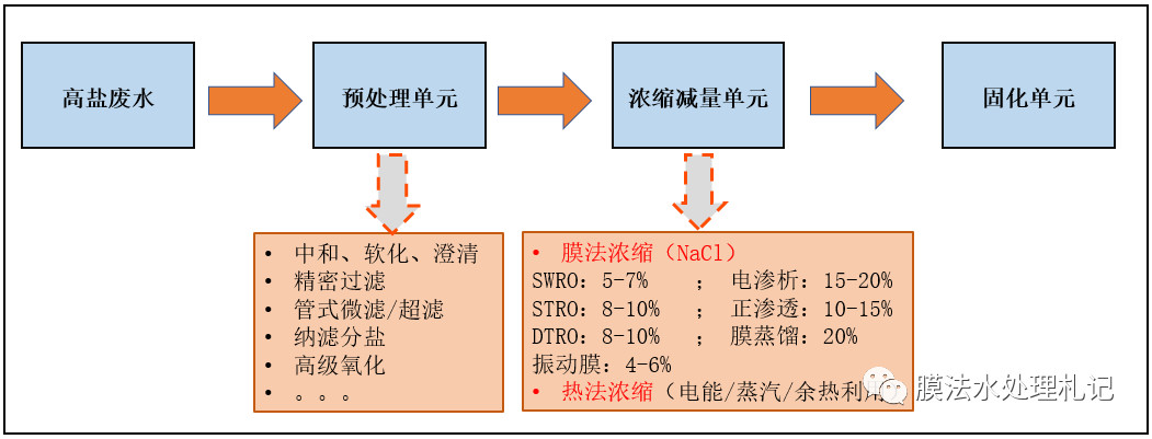 這些(xie)年零排放(fang)組合工藝越(yue)來越(yue)成熟(shu),盡管可選的配套工藝繁多,但是總結歸(gui)納下來,末端高鹽廢水(shui)處理系統主要含以下幾(ji)個單元: